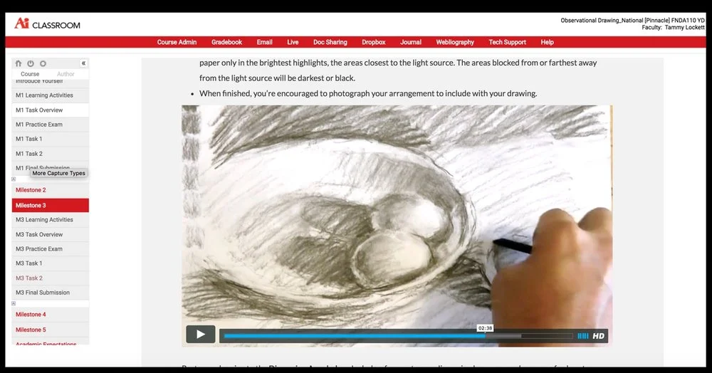 The first of its kind, Observational Drawing set the bar for course design across all AiOnline programs. As the Subject Matter Expert, (SME) I had the opportunity to write, do photography, draw and to design interactive learning tools for the course I taught that would eventually run several hundred sections each year. This course allowed me to consider how a traditional drawing studio could be experienced in an asynchronous digital environment. To achieve the level of quality I envisioned, I donated the use of 36 drawings and approximately 50 photographs of my work to the project for the benefit of my students and to demonstrate what is possible in online learning environments.